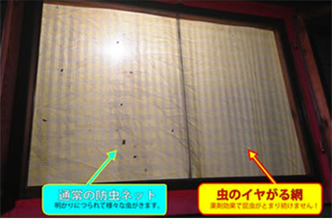 | 安全な薬剤の効果で、虫が来ても、とまり続けることが出来ず、飛んでいきます。5年~7年の効果。網押さえゴム無料交換。 | ||