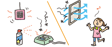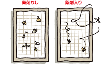 薬剤の効果で、虫が来てもネットにとまり続ける事ができず、やがて飛び去ります。虫を「殺さず遠ざける」配合なので、薬剤も微量。殺虫しないので、窓回りが汚れる事もありません。