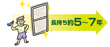 ネット自体が「虫を遠ざける」機能を持っているので、網戸の全面でむらなく効果を発揮、しかも効果は1,800~2,500日持続します。その間の交換や薬剤の再処理は不要なので、とても経済的で手間いらずなネットです。