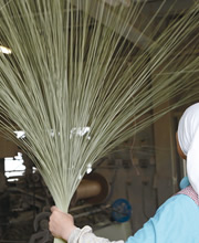 「たて糸」とは、い草を織り上げる「糸」のことです。通常は綿糸ですが、一枚のござに多くい草を織り込むには、丈夫な麻糸が使われます。高級なござには「麻」「麻+綿糸」「麻+麻」などが使われます。
